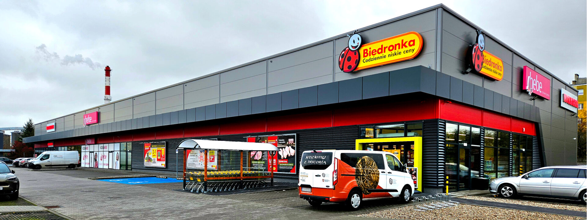 In Gniezno, we completed the second stage of the DJB Retail Park. In this stage, a 2,500 m2 retail facility was built, intended for rent. The building was designed as a single-storey, simple-form building with a flat, gable roof. The total sales area is 1,992.66 m2 and is divided into 3 retail premises with social facilities and delivery rooms. The hall casing was made of a sandwich panel in shades of grey, the decorative elements are burgundy-coloured panels above the entrances and corrugated sheet metal and composite panels on the front elevation.