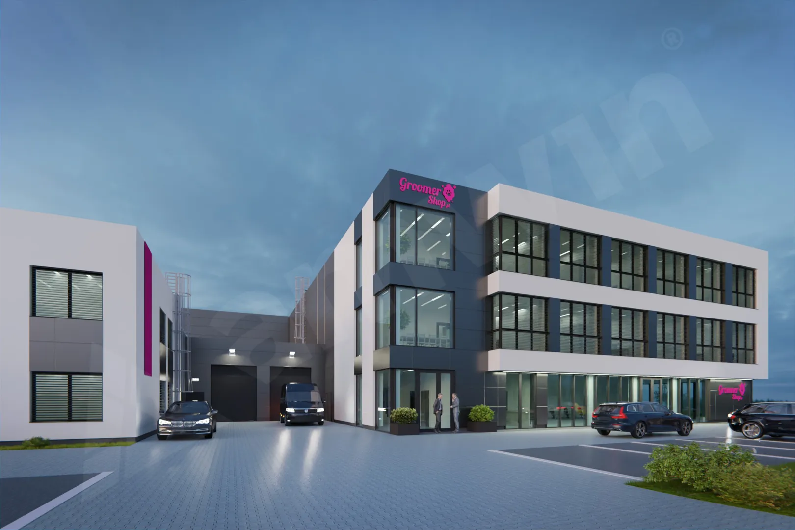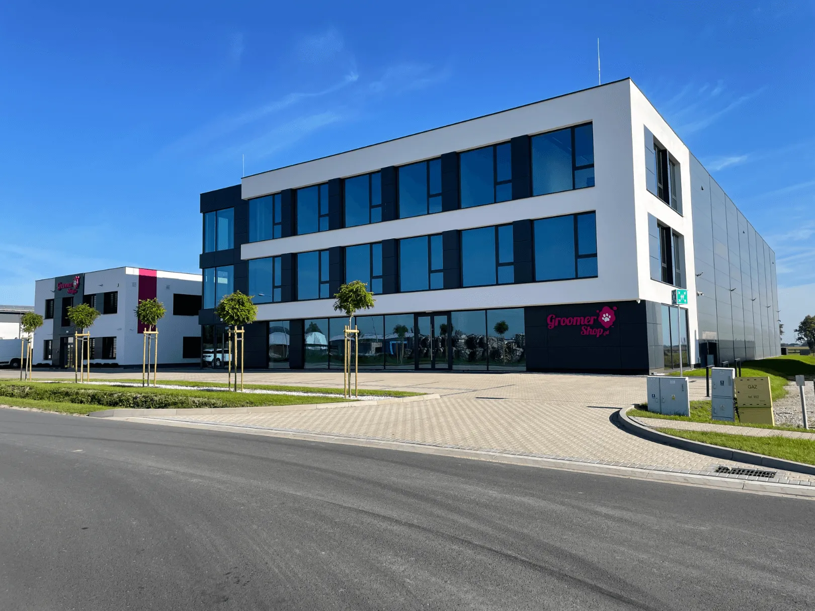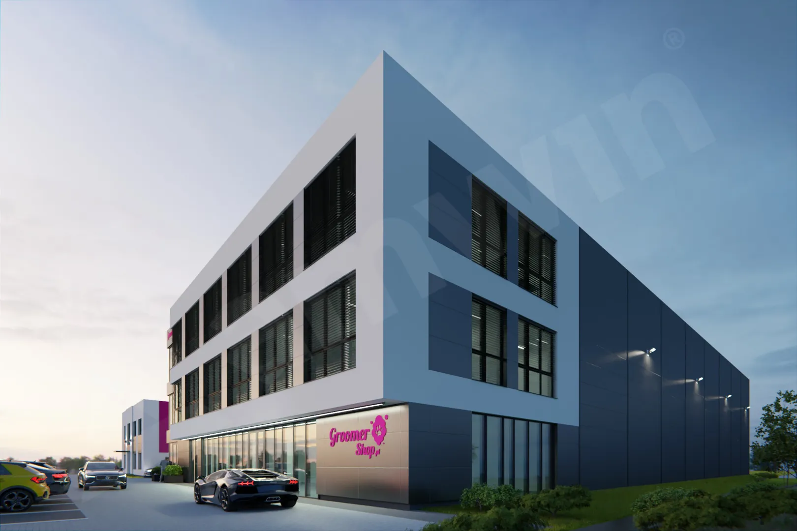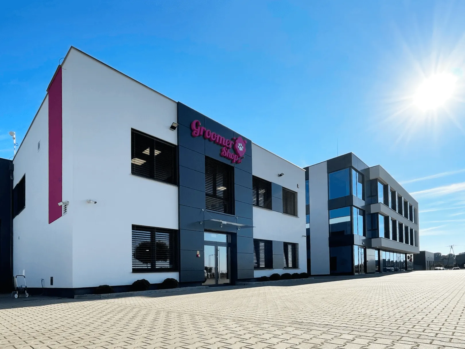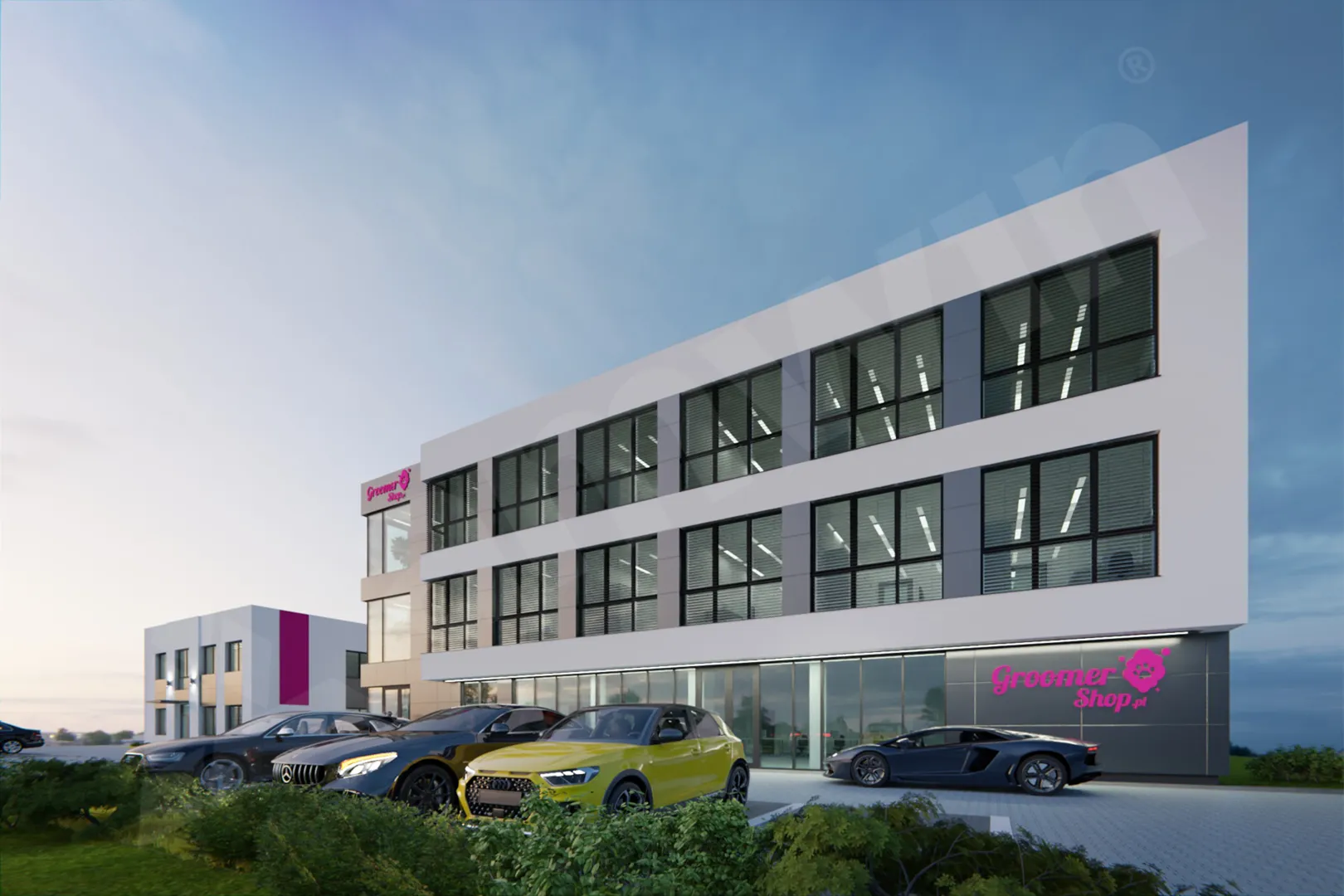Our design-build project was created for the dynamically developing GroomerShop company from Pianów (near Kościan), which has been operating in the e-commerce industry for years, supplying grooming salons with the necessary equipment. The investment included a new social and office building with comfortable workplaces for the company’s expanding staff, as well as a sales showroom and a photography studio.