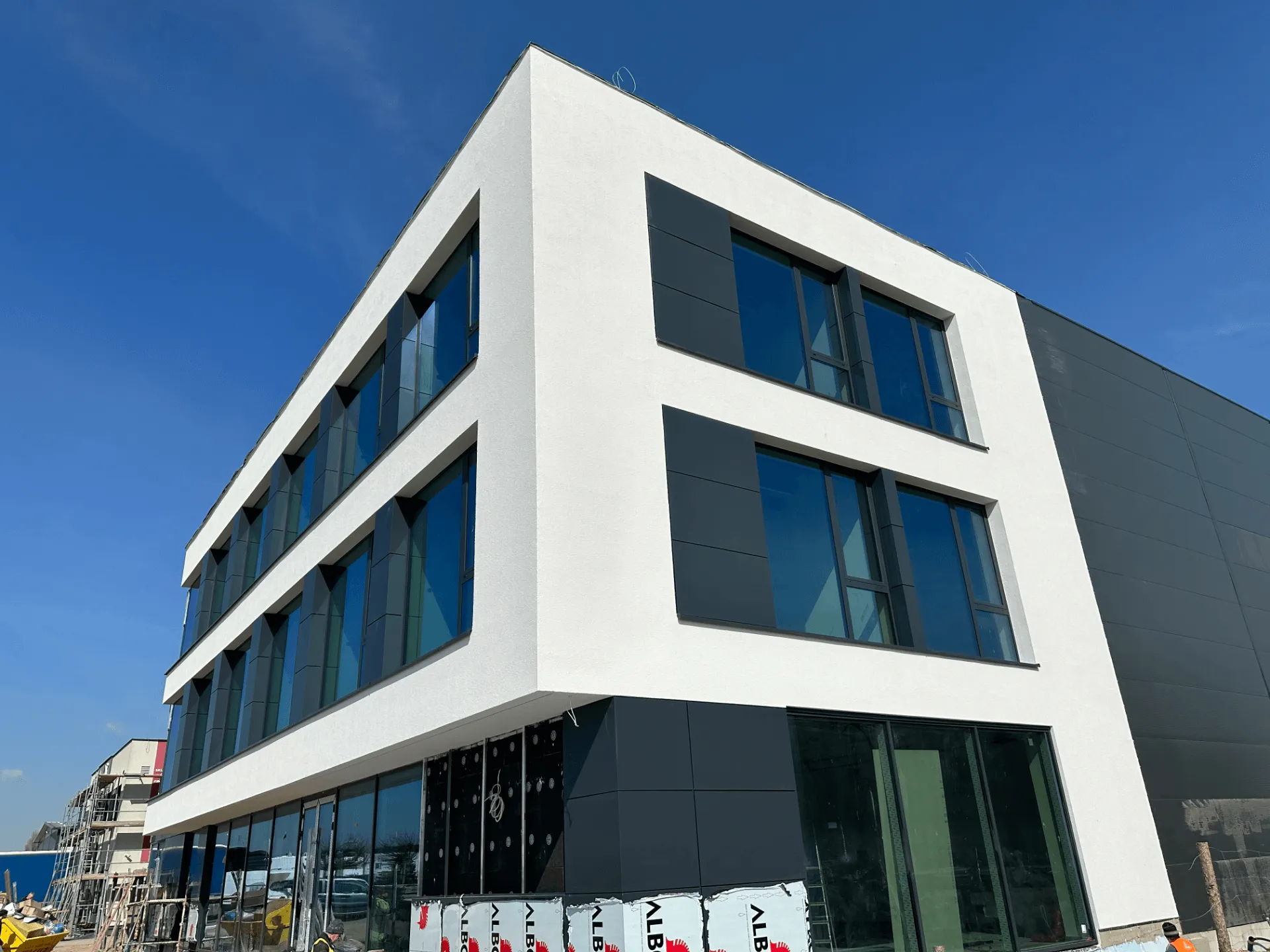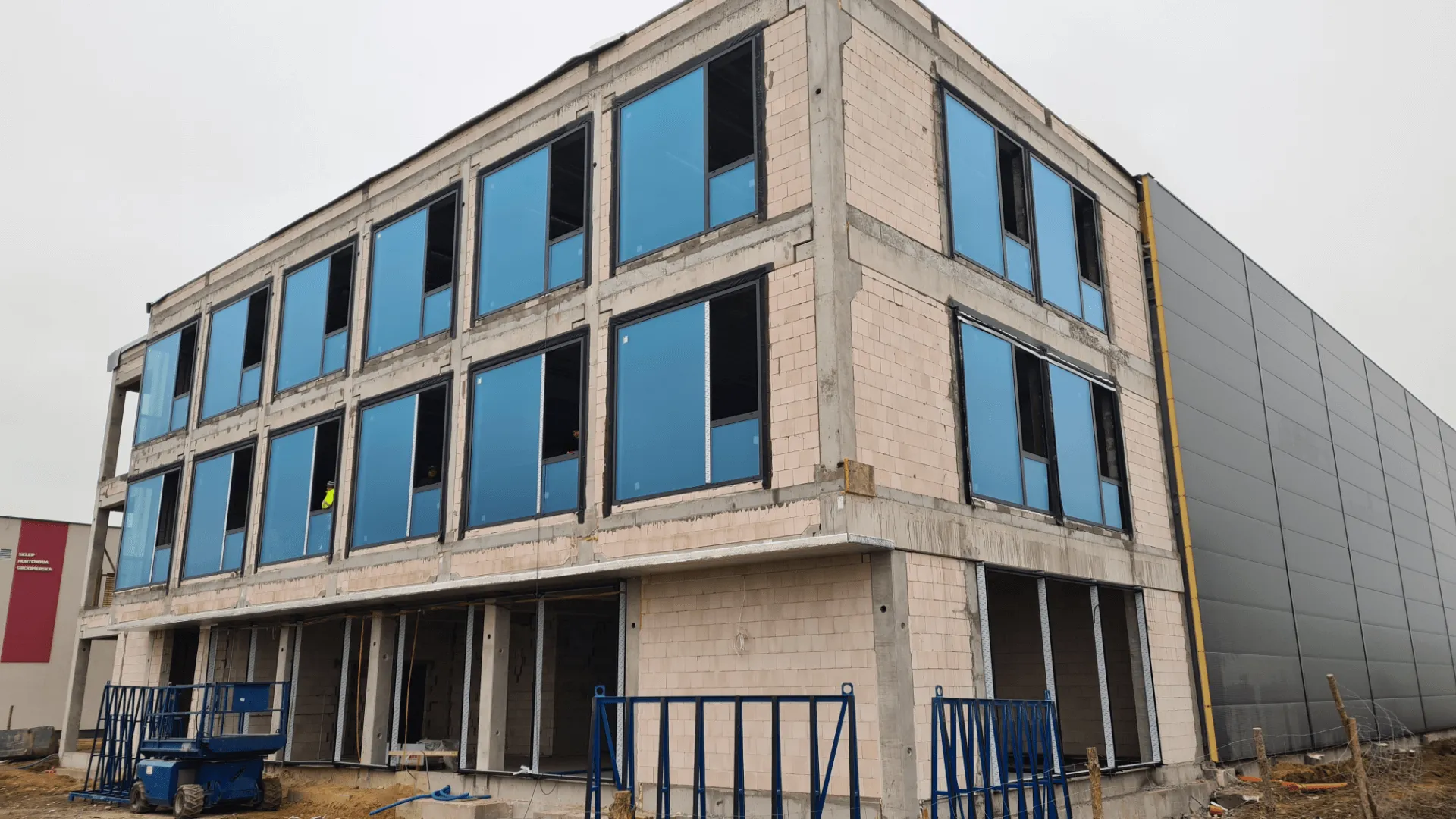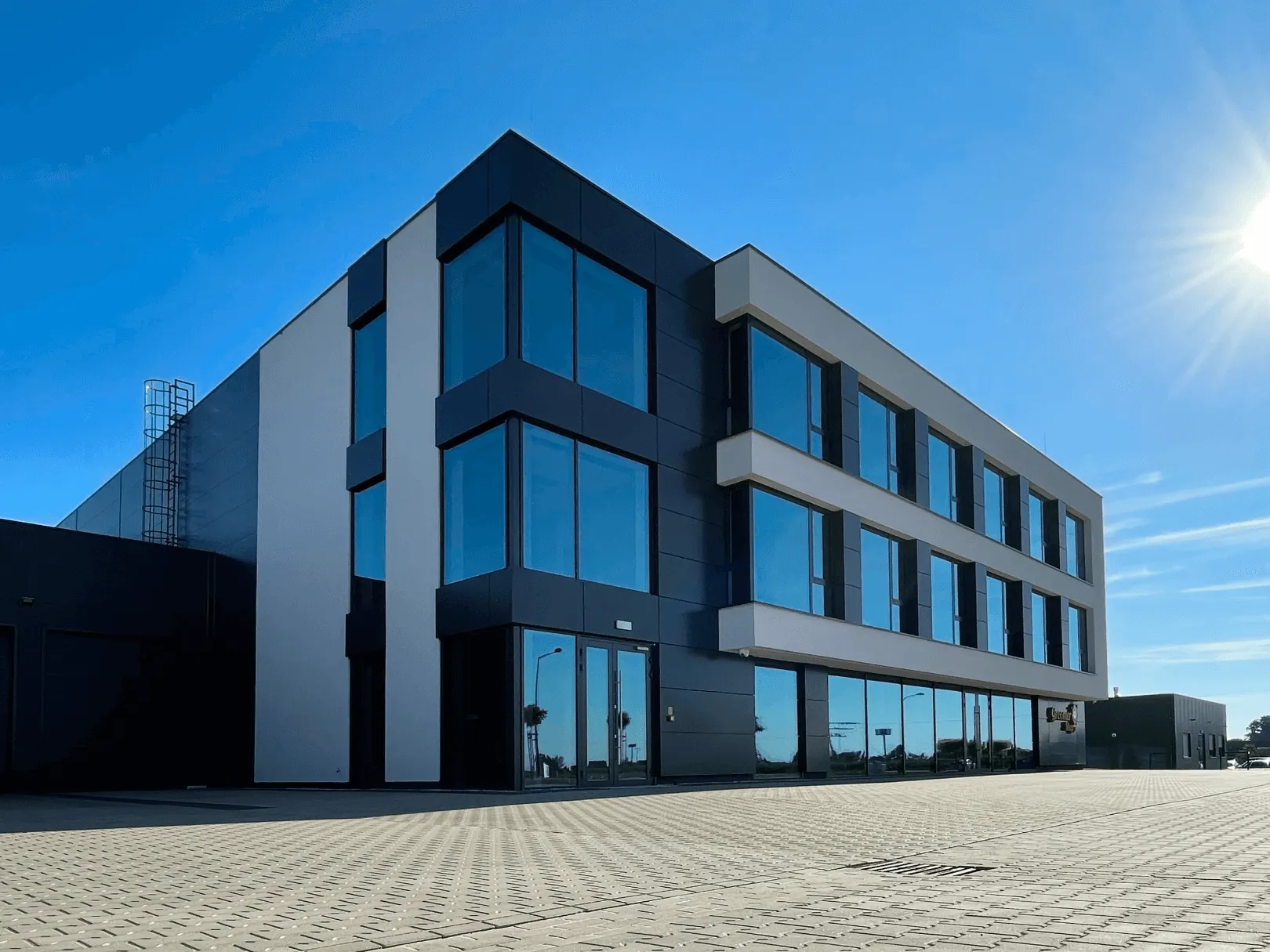 Amwin’s task included the design and construction of a three-story social and office building with a usable area of over 800 m2, which was built using brick and prefabricated technology. The building’s elevation is a combination of thin-layer plaster with aluminum composite panels. The existing development was adapted to the newly constructed building in accordance with the presented visualization, emphasizing the modern character of the company. The effect was complemented by modern window glazing packages protecting the building’s users from thermal radiation, while ensuring maximum lighting of the workplaces.