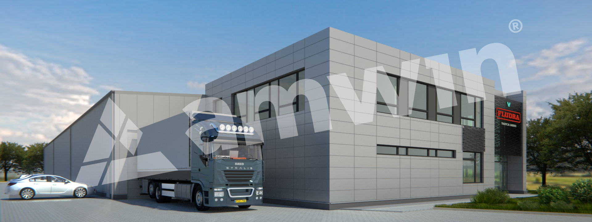 Concept, full-discipline design of a production hall with an office and social zone, development and hardening of the area around the building, industrial flooring, and external infrastructure. The hall features a steel structure, the external walls of the hall feature sandwich panels with a polyurethane foam core, the roofing features sandwich panels with a polyurethane foam core. The hall is equipped with a 5 t overhead crane. The office building features a steel structure with metal cladding and a glass facade.