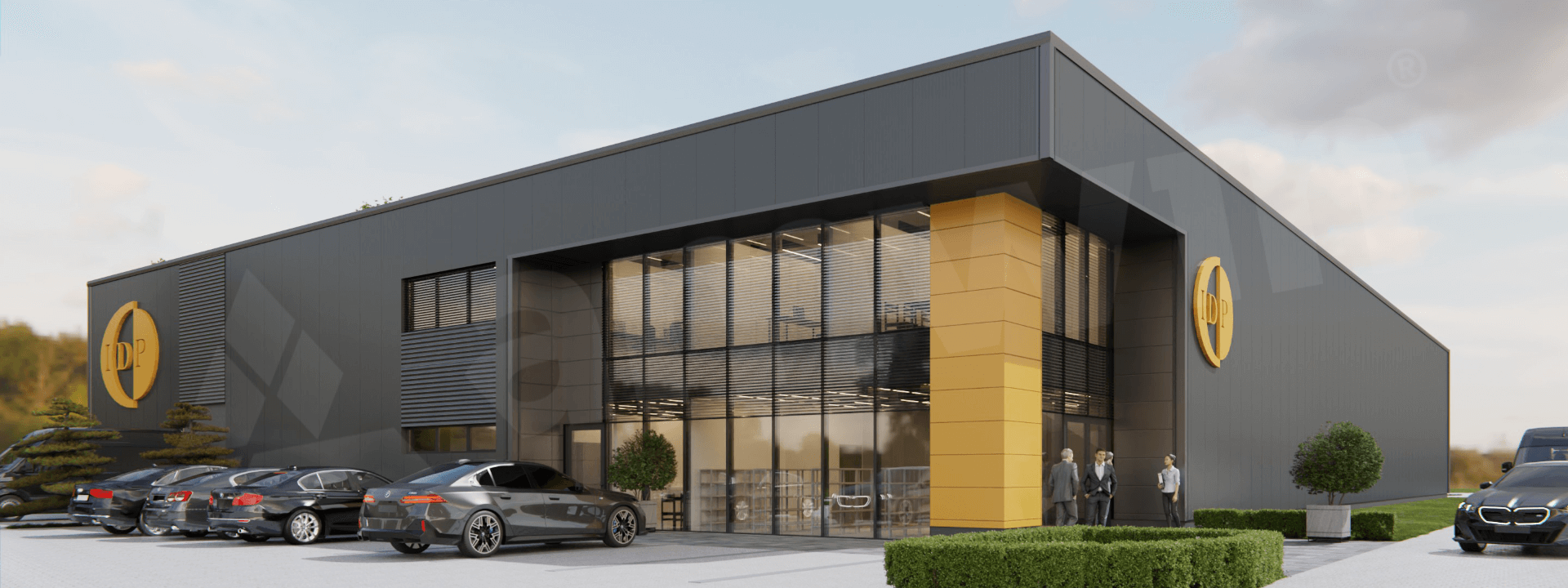 In Dalanówek, we are building a warehouse hall with a social and office part and paved areas and accompanying infrastructure. It will be a low building, with a simple form, with a flat roof and an attic, which we designed as a two-story building in the office part. The social and office part will be set back from the external wall of the warehouse.